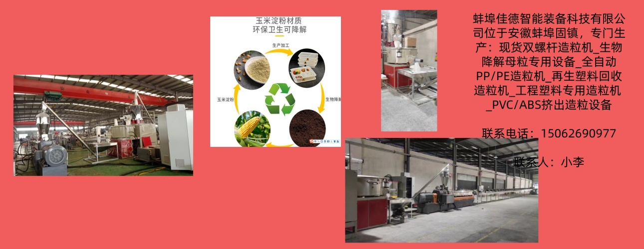蚌埠佳德智能装备科技有限公司位于安徽蚌埠固镇,专门生产:现货双螺杆造粒机_生物降解母粒专用设备_全自动PP/PE造粒机_再生塑料回收造粒机_工程塑料专用造粒机 _PVC/ABS挤出造粒设备